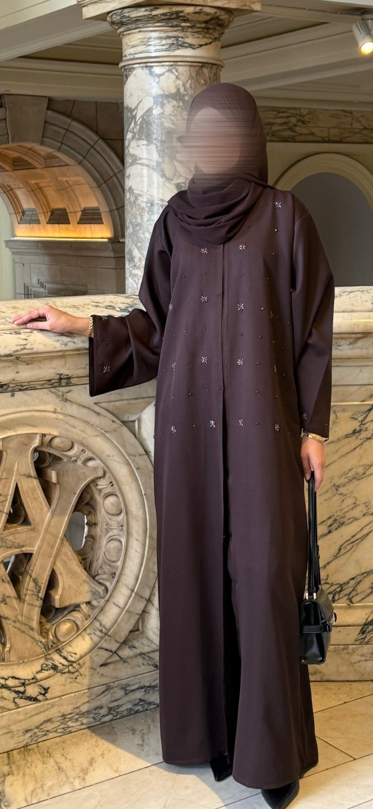 A chic two-piece abaya, beautifully detailed with delicate embroidered motifs and finished with a sleek straight cut.