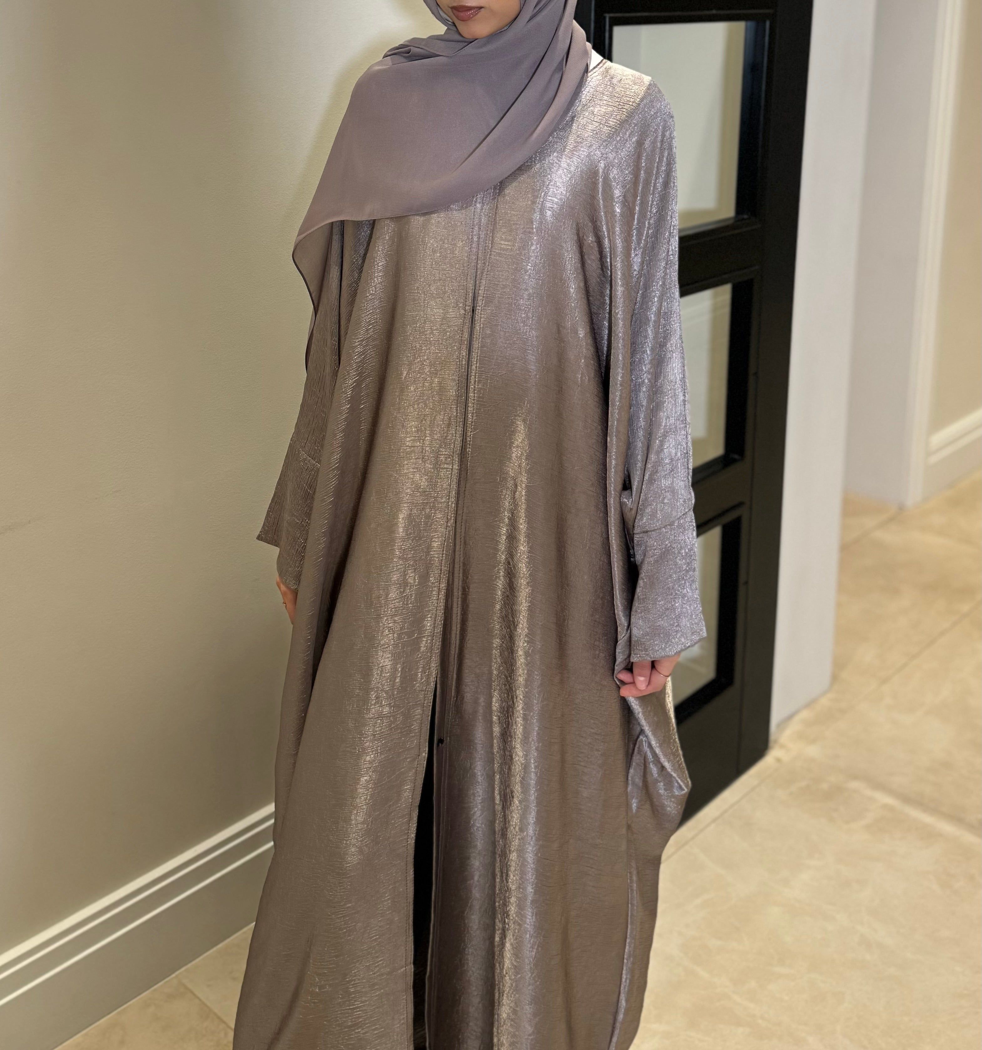 A shimmering two-piece farasha abaya that blends timeless elegance with effortless style.