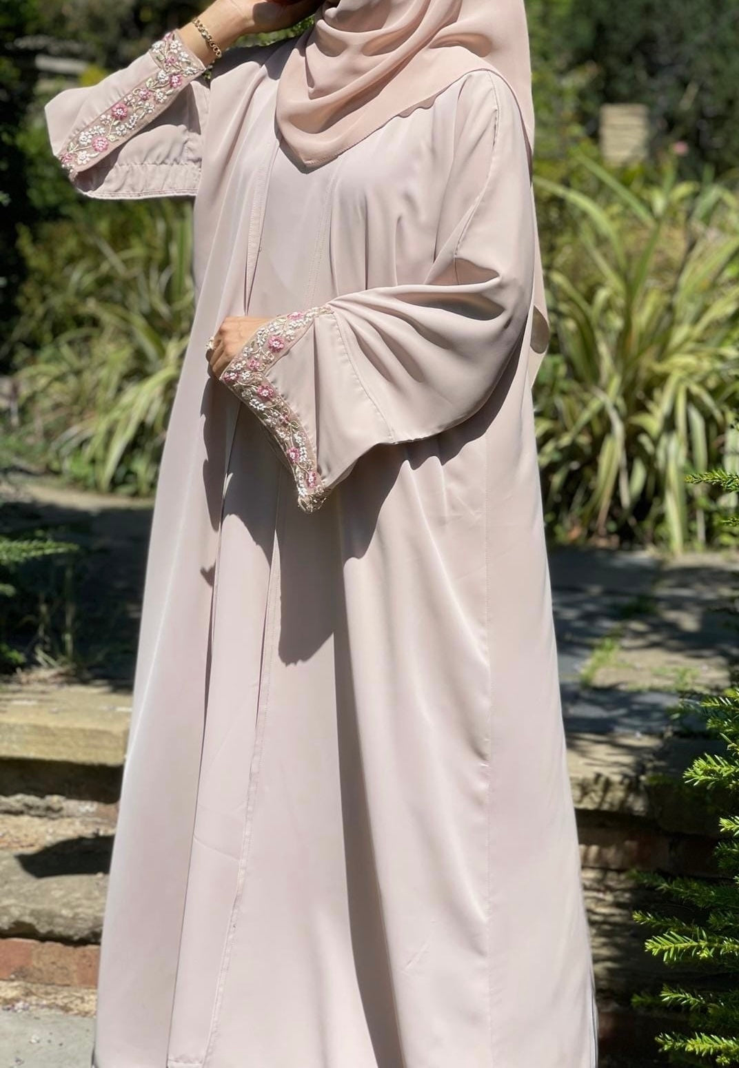 Graceful and refined, this flared three-piece abaya features intricate floral embroidery on the sleeves for a truly elegant look.