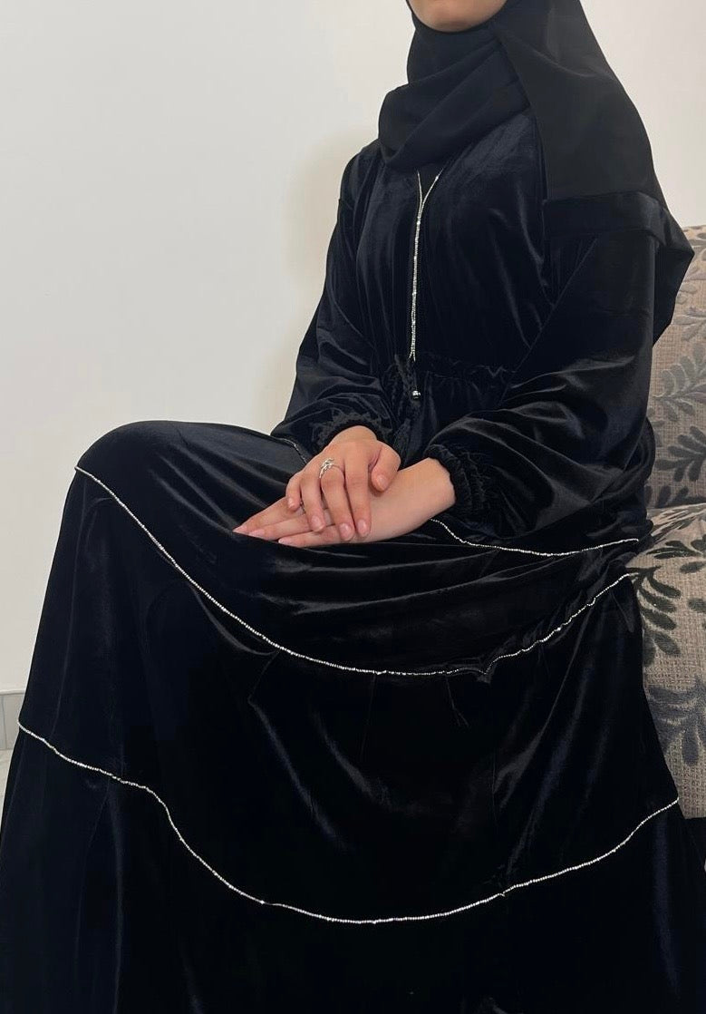 A two-piece velvet abaya featuring a drawstring for a flattering fit, tiered silver beading and cuffed sleeves for a sophisticated touch.